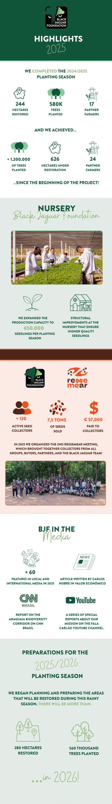 The past year was marked by extensive work in the field, growing and learning, realizing ecological restoration of the Araguaia Biodiversity Corridor. We continue to strengthen rural partnerships, expand our seedling production capacity, and connect environmental restoration with livelihood creation through Ressemear, the BJF Araguaia Seed Network.